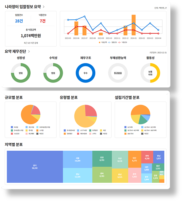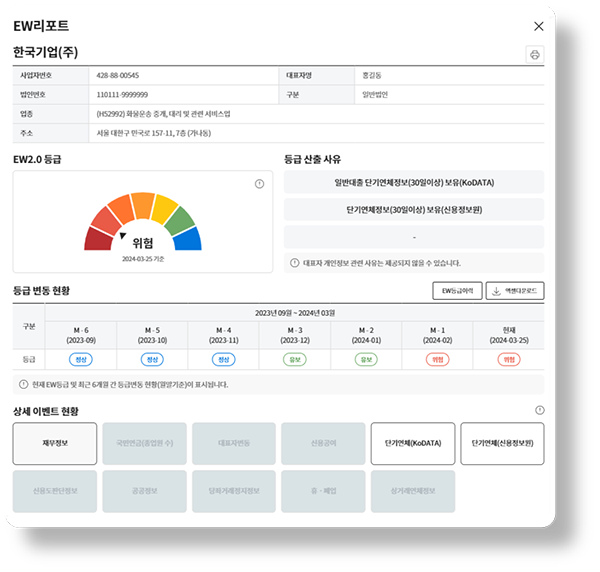 - 신용정보(단기연체 등), 국민연금, 경영진, 연혁, EW등급, 입찰정보 등