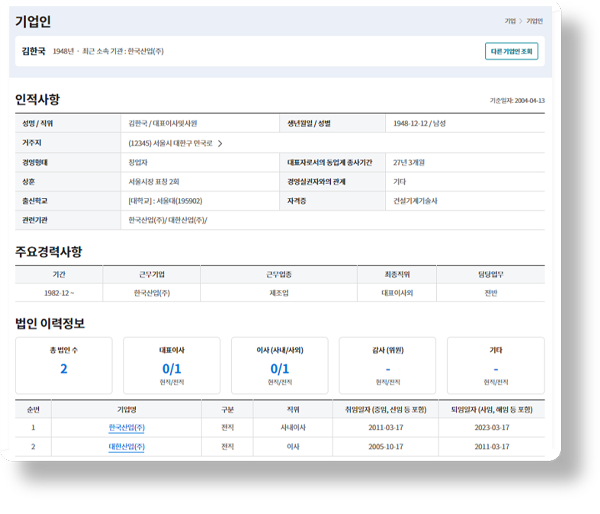 - 기업인 조회 서비스(구)크레탑 경영이력 정보